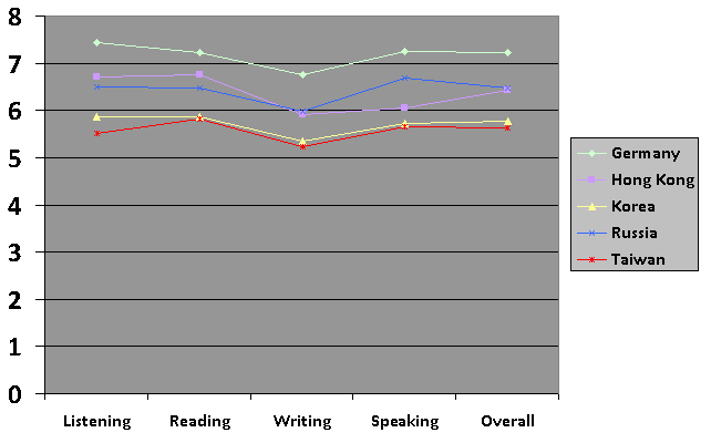 From the examples provided, it seems clear that students in European countries did better in the test that those in East Asia, possibly because of the greater similarity to the students' first language. An exception to this is Hong Kong where students were awarded very similar scores to their Russian counterparts, each achieving an average of around 6.5, with Hong Kong students doing better in the Reading and Listening papers, and Russians doing better in the Speaking section.