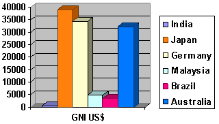 In chart two, we can see there is a massive difference in average incomes. Japanese, Germans and Australians all earn over $30,000 a year. The figures for Malaysia and Brazil are much lower, at around $5,000. In India, the average is only a few hundred dollars.