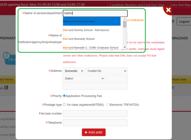 A. Electronic Test Report Form- If you’re going to apply electronic test report form, please only put shorten institution or organization name in the blank and SELECT the one you need. System will put the information in automatically.