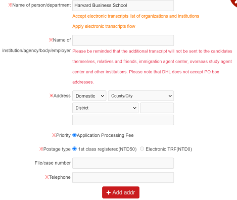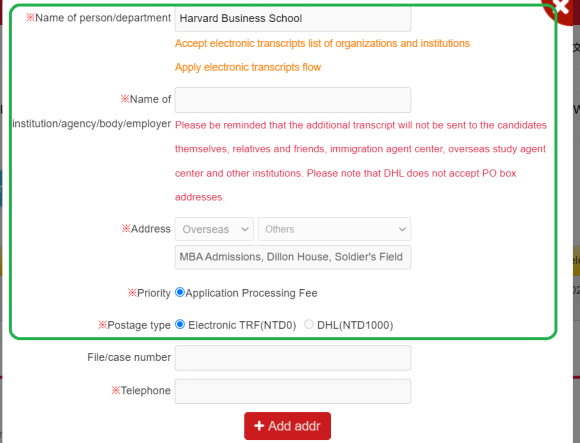 Additional TRFs and ETRFs applications cannot be modified or cancelled after successful submission, please double check your application before submission. Please contact us before send out the application if there is any questions.